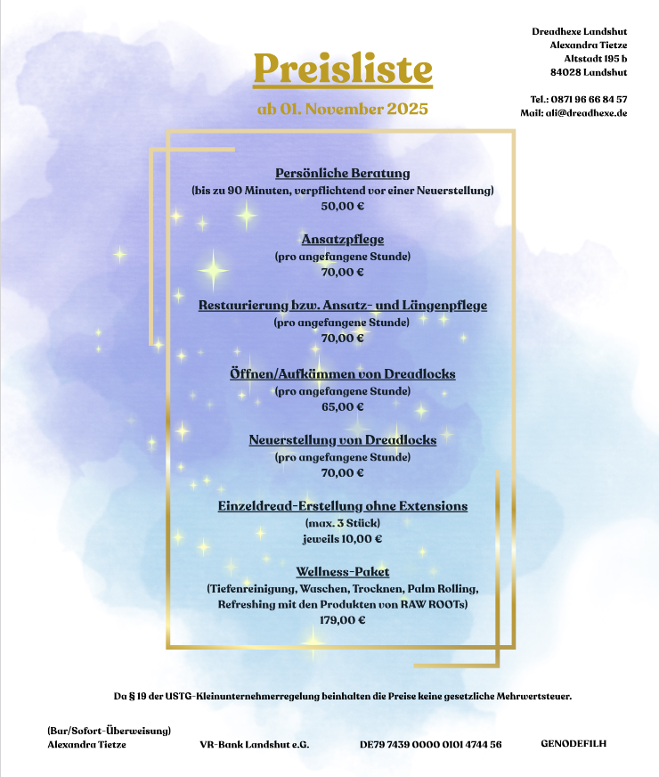 Eingegangene Anzahlungen werden nach erfolgter Dienstleistung verrechnet. Bitte daher unbedingt auf den Verwendungszweck bei Überweisungen achten, um die Anzahlung auch dem entsprechenden Termin zuordnen zu können!